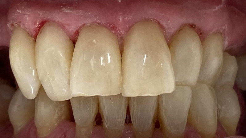 Mevrouw stoorde zich aan het spleetje tussen haar voortanden. Ze twijfelde of ze hiervoor een beugel ging nemen. Met tijdelijke composietfacings kreeg ze een indruk hoe het eruit zou zien als wij het met deze manier op gingen lossen. Uiteindelijk heeft mevrouw er toch voor gekomen om een beugel te nemen en konden de tijdelijke composietfacings gemakkelijk verwijderd worden.